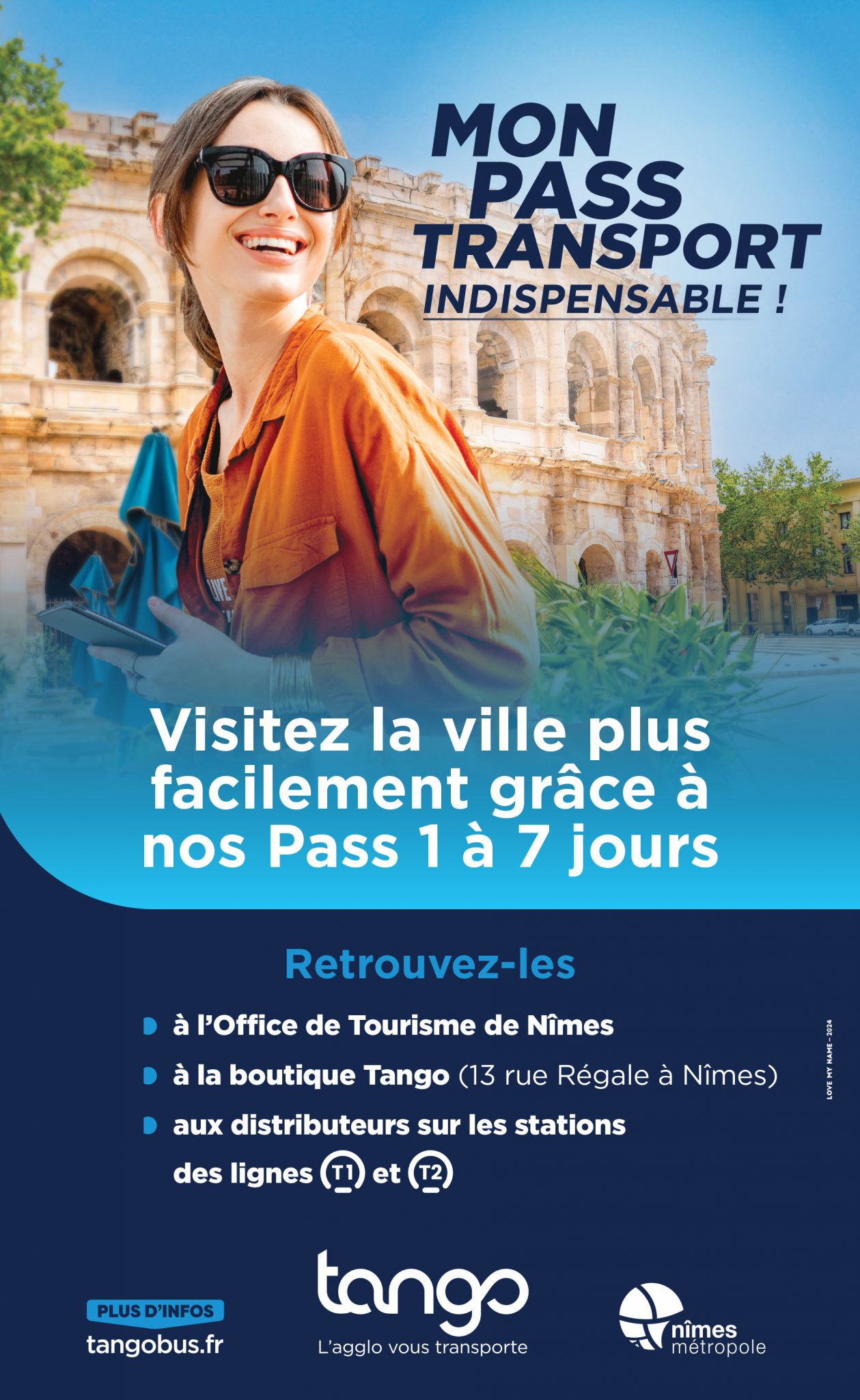 Le réseau TANGO dessert l’ensemble des communes de Nîmes Métropole. Les bus roulent toute l’année même les dimanches et jours fériés sauf le 1er mai. Les tickets et les abonnements sont en vente dans la boutique TANGO – 13 rue Régale ainsi que chez les dépositaires de la Ville de Nîmes et des communes de l’Agglomération nîmoise. Plusieurs Distributeurs de Titres sont également à votre disposition sur l’ensemble du tracé des lignes T1 et T2.